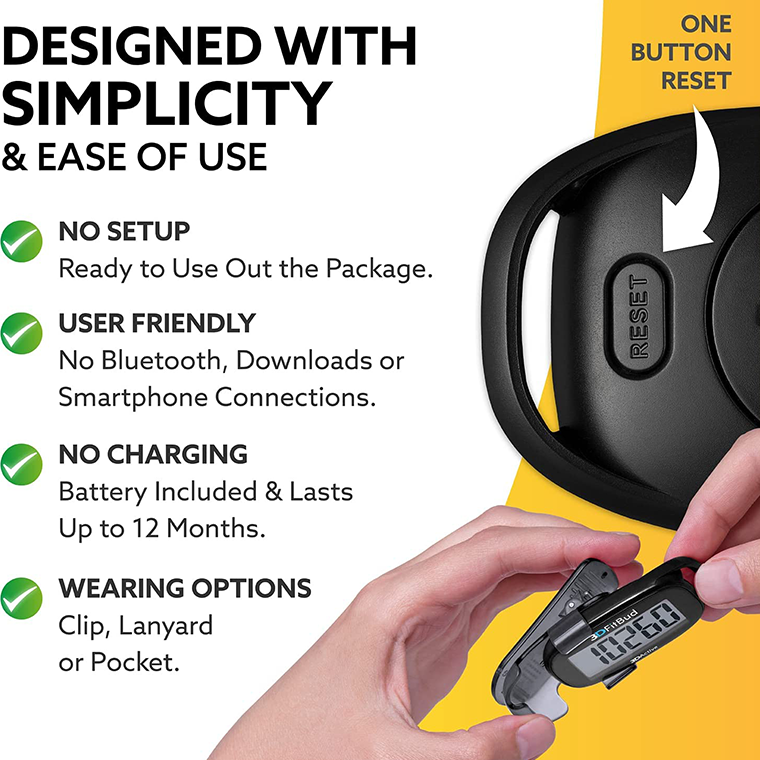 EXTRA LARGE DIGIT DISPLAY – With full screen display you can clearly and easily read the numbers at a glance. BATTERY INCLUDED – Enjoy Great Battery Life. Pedometer auto sleeps when you are not moving and auto wakes and counts steps when you start moving again.